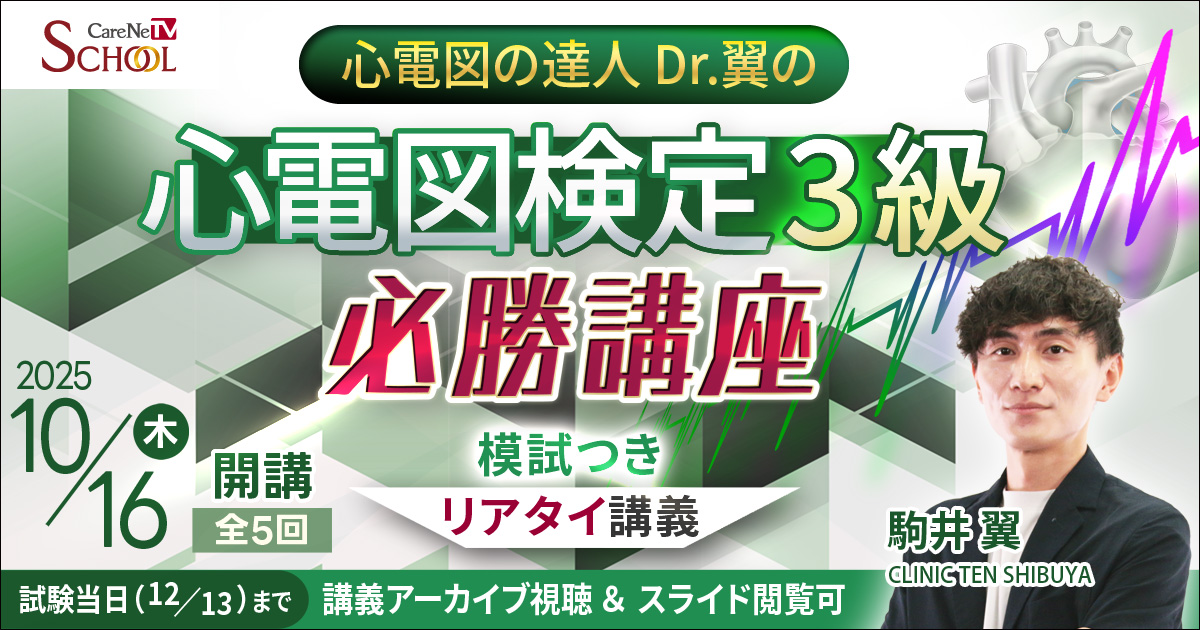 心電図判読能力を測る客観的な指標として人気を集める心電図検定。その対策番組がCareNeTVに登場しました。ターゲットは一般臨床医や循環器科勤務のコメディカルを対象とした3級合格。心電図検定1級合格者で国家試験受験指導の講師としても人気のDr.翼こと駒井先生が、3級取得を目指す皆さんのために合格の要となる必修10テーマについてそのポイントをレクチャーします。各回冒頭で本番を意識した模擬問題を出題。その後、電子黒板を活用した臨場感あふれる講義がスタートします。心臓の電気生理などの基本を大切にしたわかりやすい解説を通じて心電図の本質をつかみ、ぜひ合格の栄冠を勝ち取ってください。